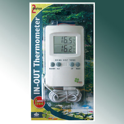 Μετρά την εξωτερική και την εσωτερική θερμοκρασία και αποτυπώνει και το ελάχιστο και το μέγιστο έξω και μέσα. Καλώδιο 2 μέτρων. Φάσμα μέτρησης: -50 έως +70 βαθμοί κελσίου